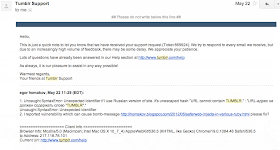 I'm pissed off explaining to technical support of Tumblr what is the vulnerability and how to fix it. Getting reply "What is your browser and which OS do you use" - WTF, why do you waste my time? :(