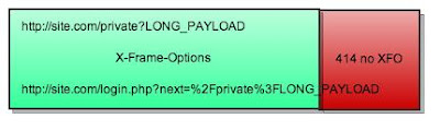 During the research I found unrelated but interesting attack vector, based on X-Frame-Options detection (Jeremiah wrote about it) and 414 error (URI is too long).Server error pages almost never serve X-Frame-Options header and this trick can be applied for many popular websites using X-Frame-Options.